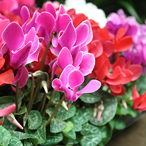 Цикламен. Всех возможных расцветок, с бахромчатыми лепестками, от милипусеньких экземпляров в 6 диаметре до гигантских сортов в 17 диаметре горшка. Эти нежные и очень яркие красавцы неприхотливы, тенелюбивы, не терпят залива и периодически уходят на покой… Если луковица не гнилая, не спешите их выбрасывать – они проснутся через пару месяцев и вновь будут радовать ваш взор.