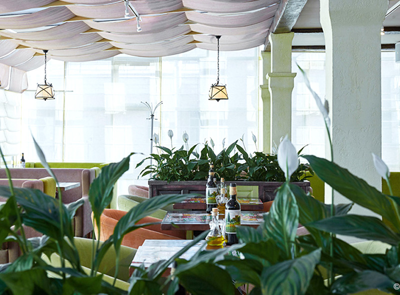 Использование растений в кафе и ресторанах позволяет решать не только эстетические задачи, но и проблемы, связанные с грамотным расположением элементов. Они могут выступать «перегородками» помещения, разбивая его на функциональные зоны. К примеру, выполнятся в качестве «ширмы» между центральным залом и площадкой для малышей. Более того, разрабатывая программу озеленения, специалисты FLORS обязательно учтут особенности и специфику заведения, расположив растения так, чтобы они позволяли свободно перемещаться по его территории.
